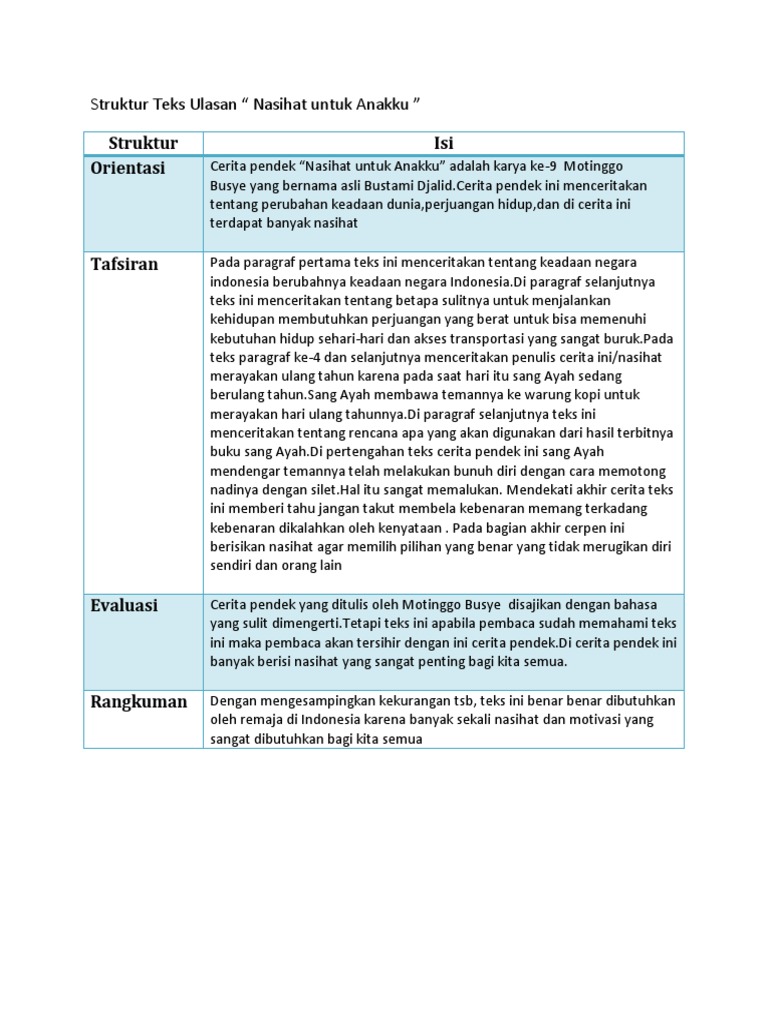 Sebuah page untuk berbagi nasihat yang bersumber dari al quran dan hadist. Cerita pendek ini berkisah tentang nasihat seorang ayah kepada anaknya, atau mungkin kepada kita semua. Bagaimana kejadian dari cerita pendek nasihat untuk anakku, langsung saja kalian simak dari ulasan cerpen yang akan saya berikan dibawah ini. Nasihat untuk anakku adalah cerpen karya seorang sastrawan bernama asli bustami djalid. Setelah itu ia membangunkan anaknya untuk pulang, karena luna masih sekolah hari ini. Cerpen ini menceritakan tentang nasihat seorang ayah kepada anaknya tentang perjalanan terjal seorang pengarang dalam menghadapi kerasnya hidup. Cerpen ini memuat kehidupan sang ayah, beserta di dalam mengulas cerpen, hal penting yang harus diperhatikan adalah gambaran umum, ringkasan, serta kelebihan dan kekurangan dari cerpen tersebut. Pada kegiatan ini siswa diharapkan dapat menghasilkan teks ulasan cerpen nasihat untuk anakku sesuai dengan struktur teks yang sudah siswa kuasai. Pada tugas 4 ini kamu diminta untuk mengulas cerpen nasihat untuk anakku karya motinggo busye secara berkelompok. Jadi, dengan mempelajari cerpen (sastra) berarti siswa diajak untuk mempelajari manusia dan lingkungannya. Tiap kelompok terdiri atas 3—5 siswa. 1) prihatin melihat keadaan indonesia yang saat itu sedang krisis ekonomi 2) gembira biarpun nilai sebuah cerita di masa ayah membikin nasihat ini cuma berharga beras delapan kilo, namun ayahmu tetap. Berjuang sendiri untuk membesarkan dan menyekolahkan dua putriku.