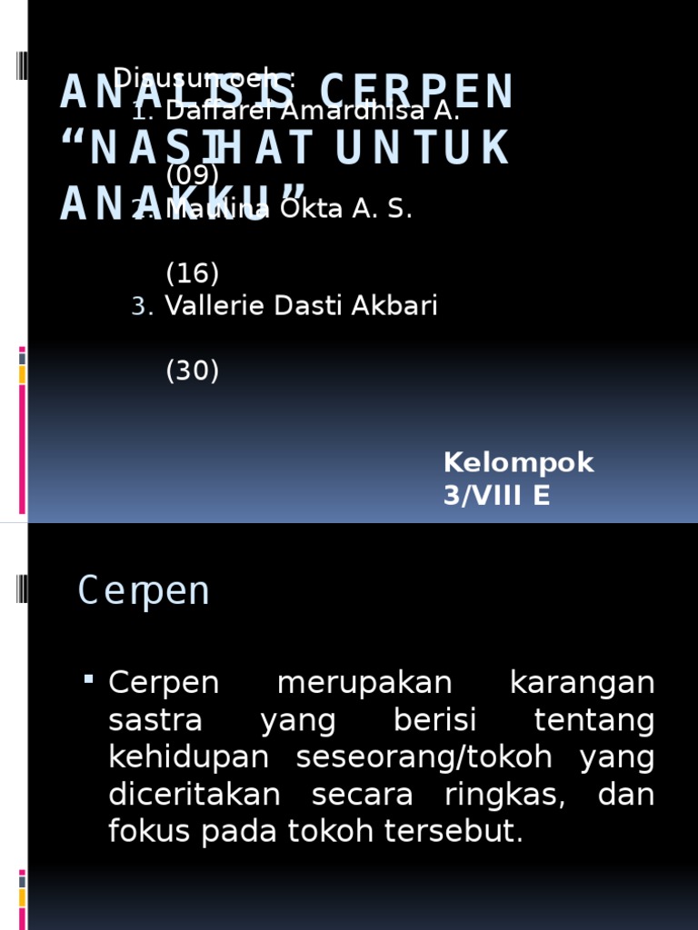 Tugas B Indonesia 13 4 2016 Docx Nama Rheza Naufal R No Kelas 31 Viiif Mengulas Cerpen U201cnasihat Untuk Anakku U201d Nasihat Untuk Anakku Adalah Cerpen Course Hero from www.coursehero.com Untuk mencari cerita pendek (cerpen) berdasarkan kata kunci tertentu, kamu bisa gunakan kotak pencarian di bawah ini! Cerpen ini menceritakan tentang nasihat seorang ayah kepada anaknya tentang perjalanan terjal seorang pengarang dalam menghadapi kerasnya hidup. Bunda bahagia sekali punya cucu baru. Sebuah page untuk berbagi nasihat yang bersumber dari al quran dan hadist. 1) prihatin melihat keadaan indonesia yang saat itu sedang krisis ekonomi 2) gembira biarpun nilai sebuah cerita di masa ayah membikin nasihat ini cuma berharga beras delapan kilo, namun ayahmu tetap. Hal tersebut dikarenakan, cerpen anak selalu memuat nilai moral yang diungkapkan dalam bentuk cerita yang menarik. Jadi, dengan mempelajari cerpen (sastra) berarti siswa diajak untuk mempelajari manusia dan lingkungannya. Pada kegiatan ini kamu diharapkan menghasilkan teks ulasan cerpen nasihat untuk anakku sesuai dengan struktur teks yang sudah kamu kuasai.